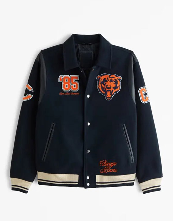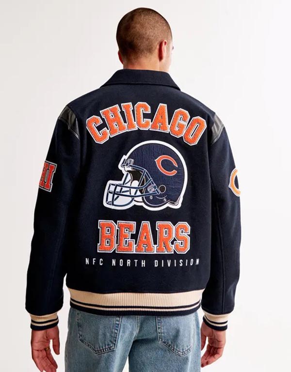 The Abercrombie Chicago Bears varsity jacket features a classic design with a sporty design. Made from high-quality wool, it boasts a vibrant navy blue body complemented by leather sleeves. This jacket is a must-buy if you are a fan of the Chicago Bears.