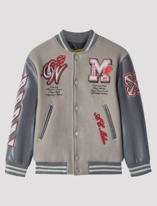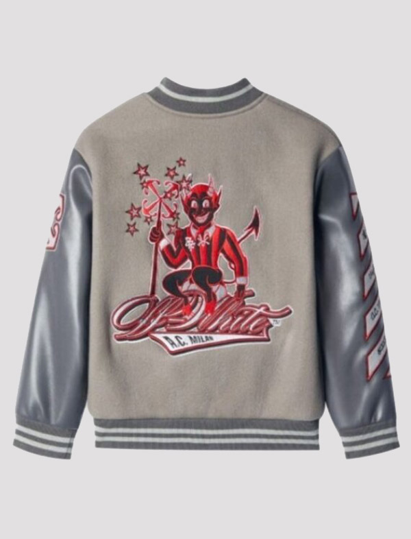 Off White X AC Milan Grey Varsity Wool Jacket and Leather Sleeves
