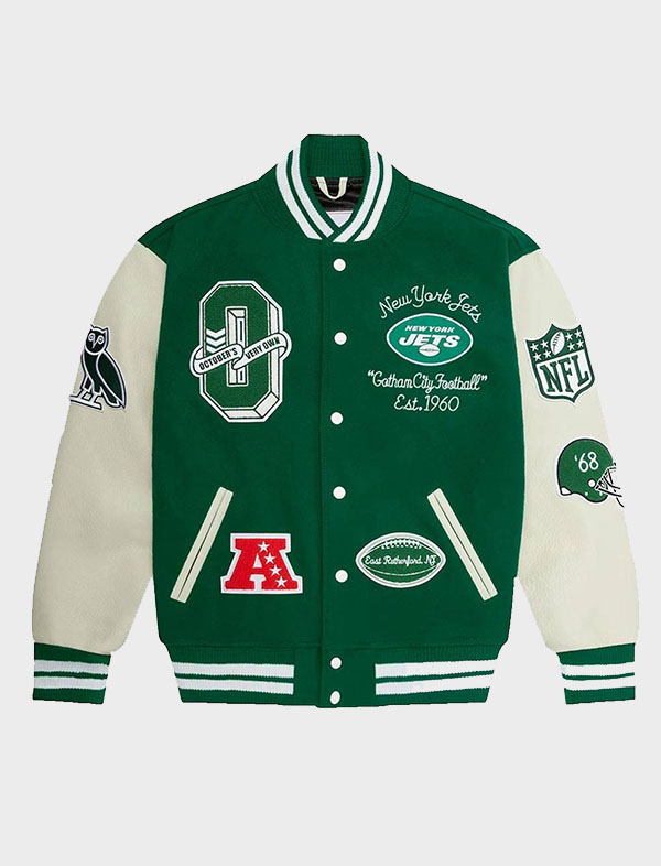 Action Bronson New York Jets OVO Green Letterman Jacket – a perfect blend of sports, music, and fashion. This limited-edition jacket merges the iconic style of hip-hop legend Action Bronson with the legendary New York Jets, topped off with the signature OVO (October’s Very Own) vibe for a truly unique look.