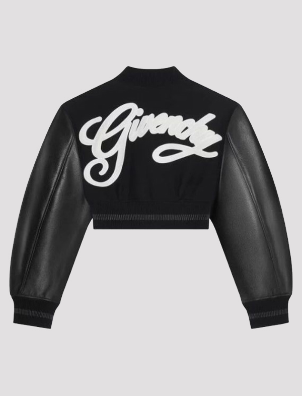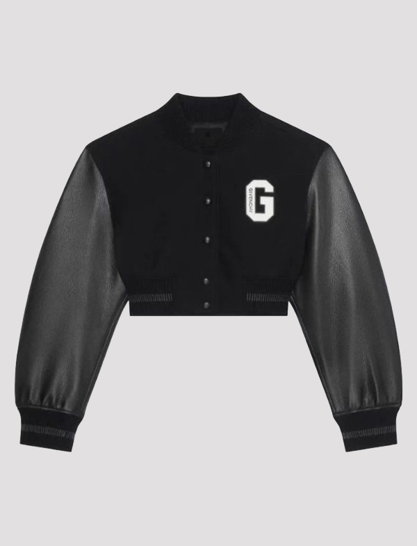 Crafted from high-quality materials, the jacket features a tailored, cropped fit that flatters the silhouette while offering comfort and warmth. The sleek design is accentuated with bold varsity details, including ribbed cuffs and hem, and eye-catching embroidery that gives it a modern, luxe twist.
