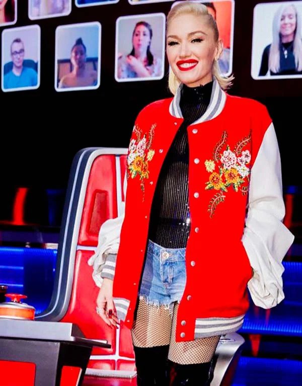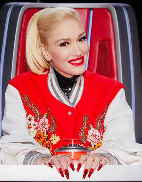 gwen stefani junya watanabe red varsity bomber jacket