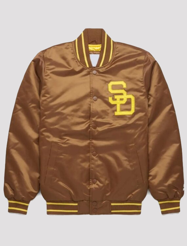 Crafted from high-quality satin, the jacket features a sleek brown colorway that nods to the Padres’ iconic retro look, complete with premium embroidery and patches that highlight the team’s storied legacy. The collaboration with Homage X brings an added layer of exclusivity and craftsmanship, ensuring this jacket stands out as a stylish yet timeless piece.