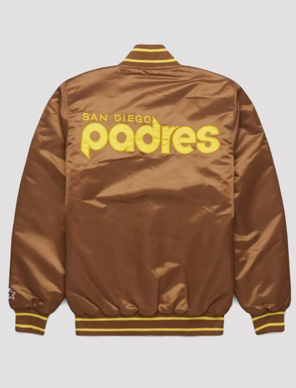 Homage X San Diego Padres Satin Brown Starter Jacket a true tribute to both the team and vintage sports fashion. This limited-edition jacket combines the nostalgic charm of classic satin with bold, modern design, making it the ultimate outerwear for any Padres fan or collector.