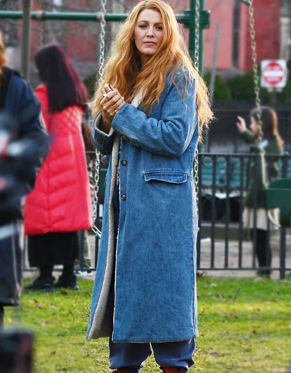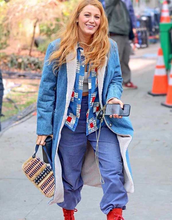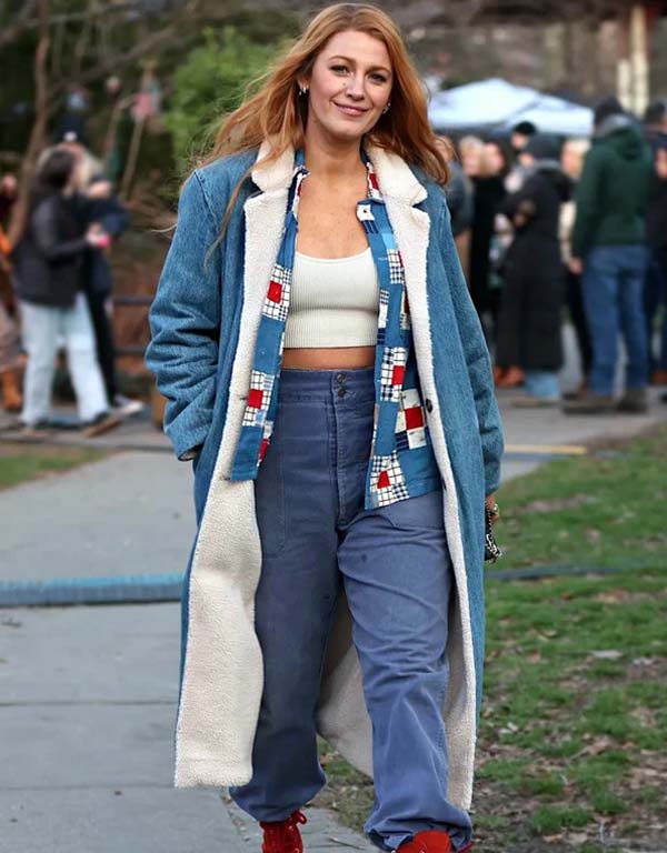 it ends with us 2024 lily bloom blake lively blue denim shearling coat