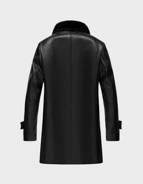 Mens Black Leather Mid-Length Coat with Fur Collar